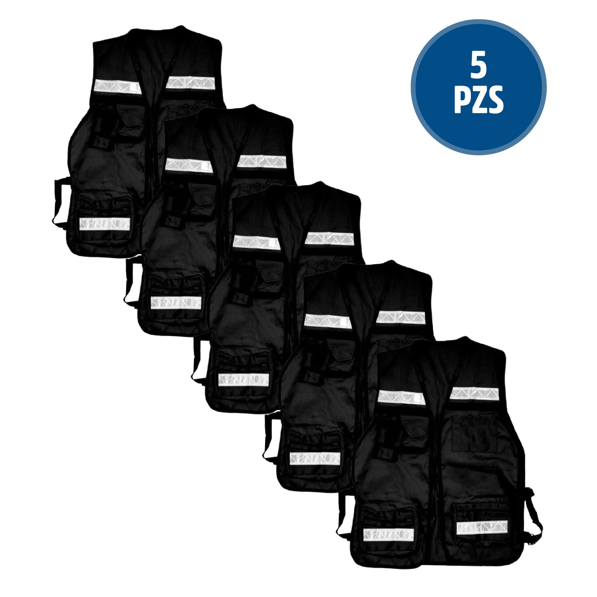Los chalecos de seguridad tienen como finalidad la visibilidad en condiciones de baja luz y espacios con alto tránsito. al ser más visible reduce las posibilidades de accidentes. *Unidad: Paquete 5pz *Material: 100% poliéster *Confeccionado en tela gabardina 25grs. 100% algodón. *Cinta reflejante tipo día y noche. *Color: Negro.