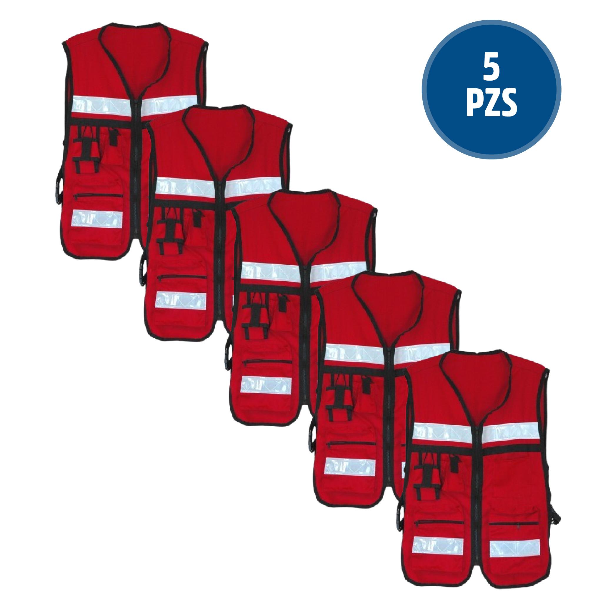 Los chalecos de seguridad tienen como finalidad la visibilidad en condiciones de baja luz y espacios con alto tránsito. al ser más visible reduce las posibilidades de accidentes. *Unidad: Paquete 5pz *Material: 100% poliéster *Confeccionado en tela gabardina 25grs. 100% algodón. *Cinta reflejante tipo día y noche. *Color: Rojo.