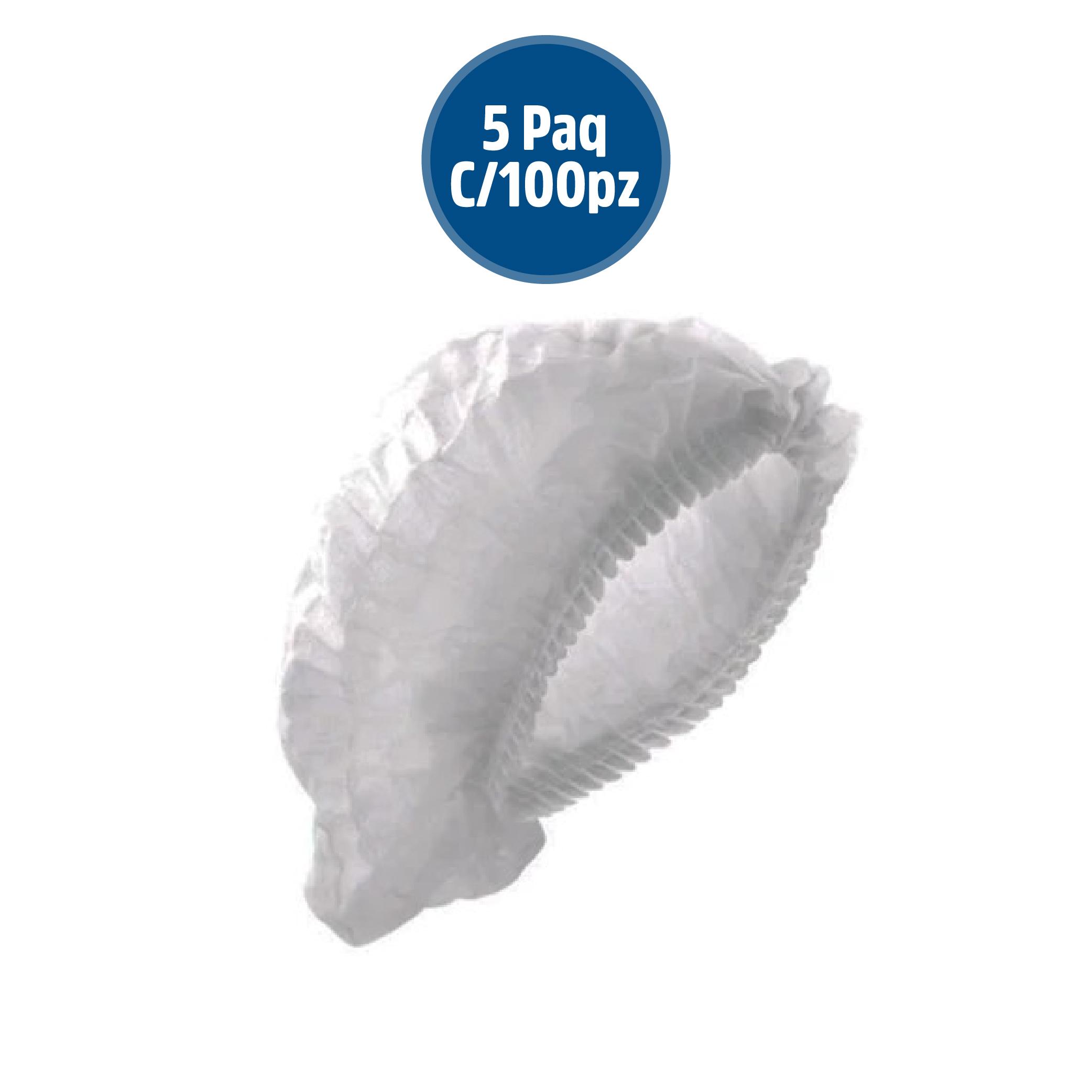 Cofia blanca desechable plisada ayuda a evitar que caigan cabellos sobre la superficie en que se está trabajando. ayudando a mantener la higiene, a reducir el riesgo de contaminación cruzada y asegurar un ambiente limpio y estéril. *Unidad: 5 paquetes con 100 pz *Material: tela 100% polipropileno *Longitud de cofia extendida 21" *Cuenta con doble liga elástica de ajuste.