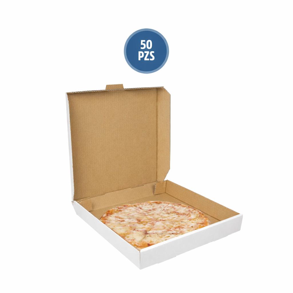 Caja de pizza fabricada en cartón resistente y de alta calidad, diseñada para conservar el calor y la frescura del producto. Su estructura protege la pizza durante el transporte, evitando deformaciones y derrames. Ideal para pizzerías, restaurantes y servicios de entrega a domicilio, ofreciendo una presentación higiénica, práctica y confiable. *Unidad: paquete 50pz *Medida: 14" *Resistencia: 23 ect *Flauta: c *Color: Blanco