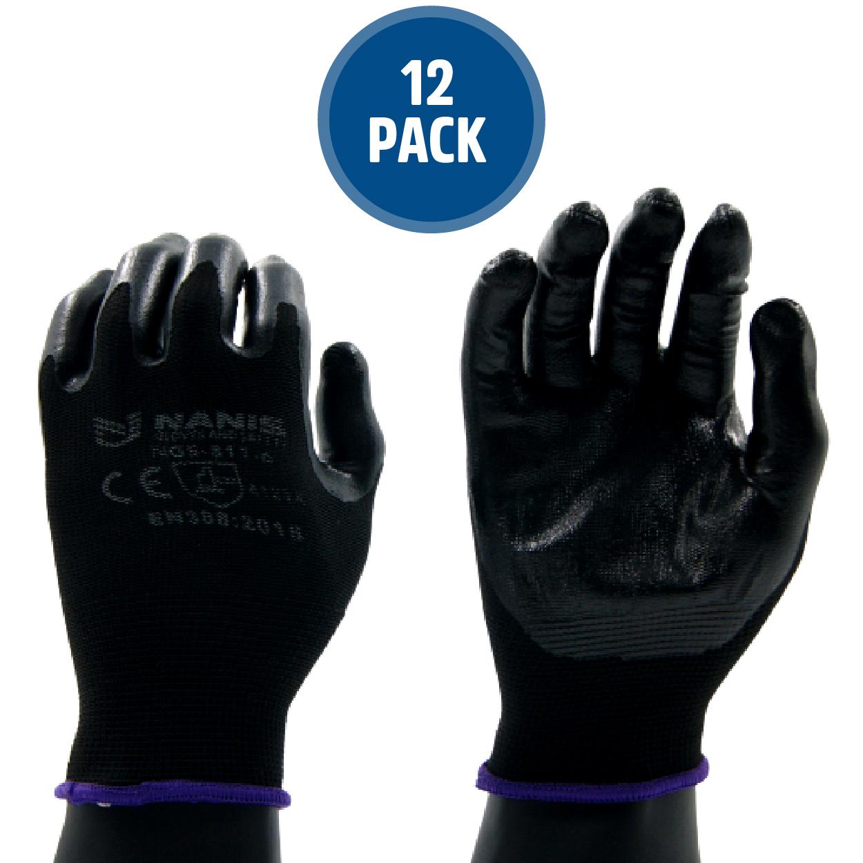 Los guantes de seguridad tienen como finalidad mejorar la destreza y agarre además de proteger las manos de una variedad de riesgos como cortes, quemaduras, exposición a productos químicos, entre otros. *Unidad: 12 pares *Talla: 6 a la 9 *Dorso sin recubrimiento para dar frescura y confort *Palma con recubrimiento de nitrilo solido *Sensibilidad al tacto *Gran resistencia y comodidad