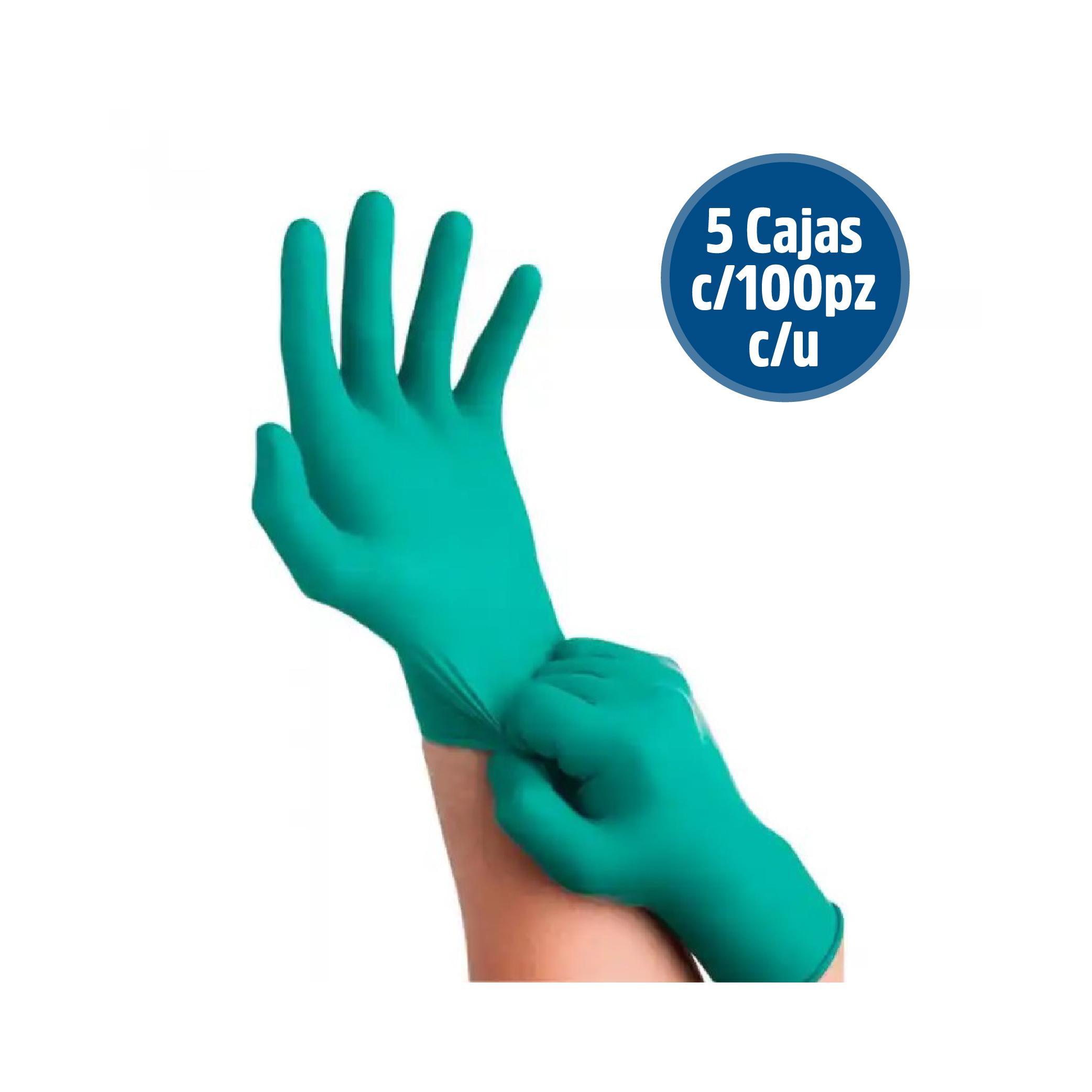 Los guantes de seguridad tienen como finalidad mejorar la destreza y agarre además de proteger las manos de una variedad de riesgos como cortes, quemaduras, exposición a productos químicos, entre otros. *Unidad: 5 cajas *Talla: chico, mediana, grande *Material: nitrilo *Tacto suave que aumenta la comodidad para uso prolongado *Aplicación ideal para alimentos, líquidos, mantenimiento, etc. *Aprobado por FDA *Color: verde